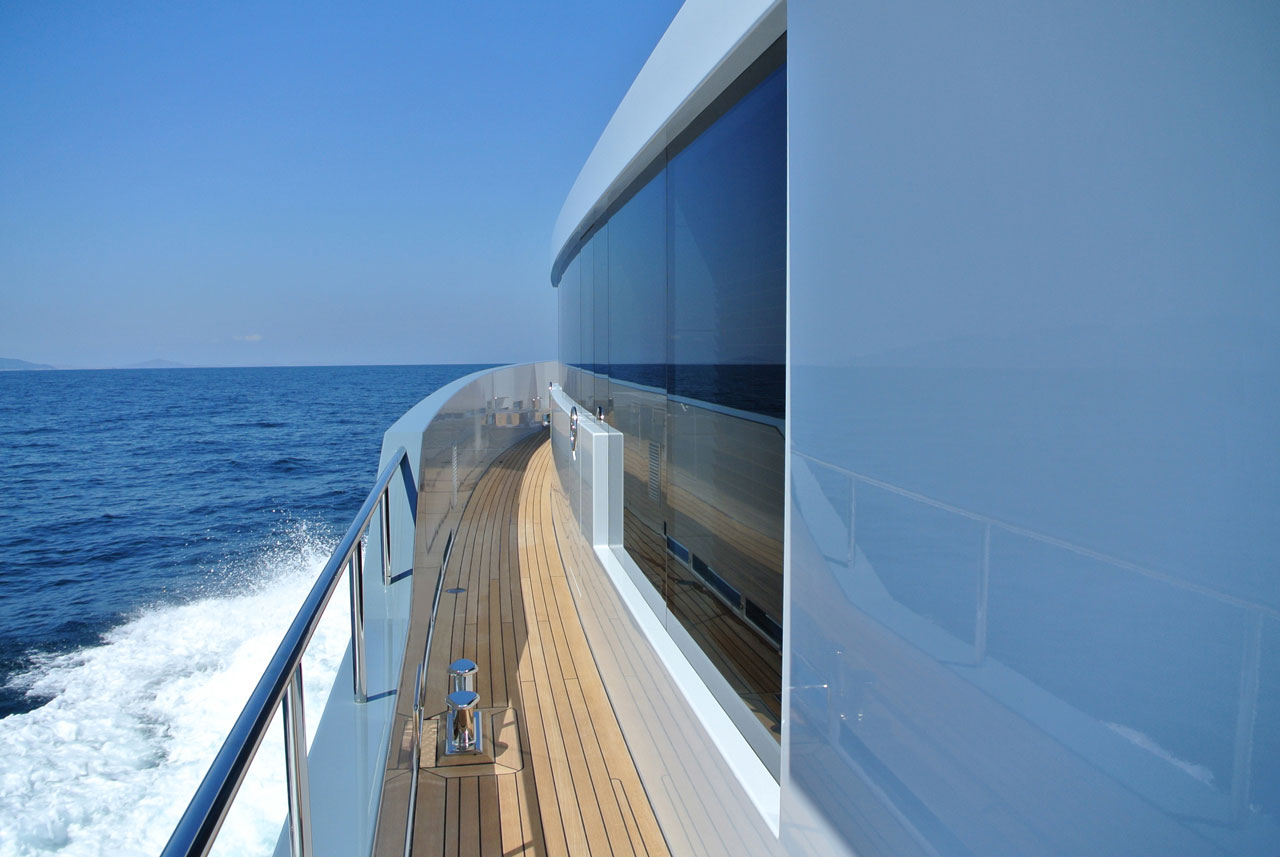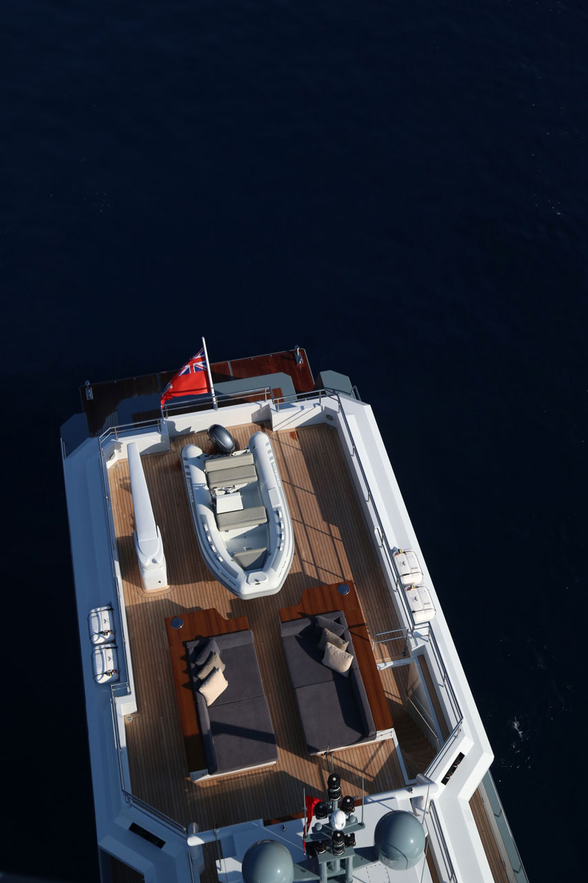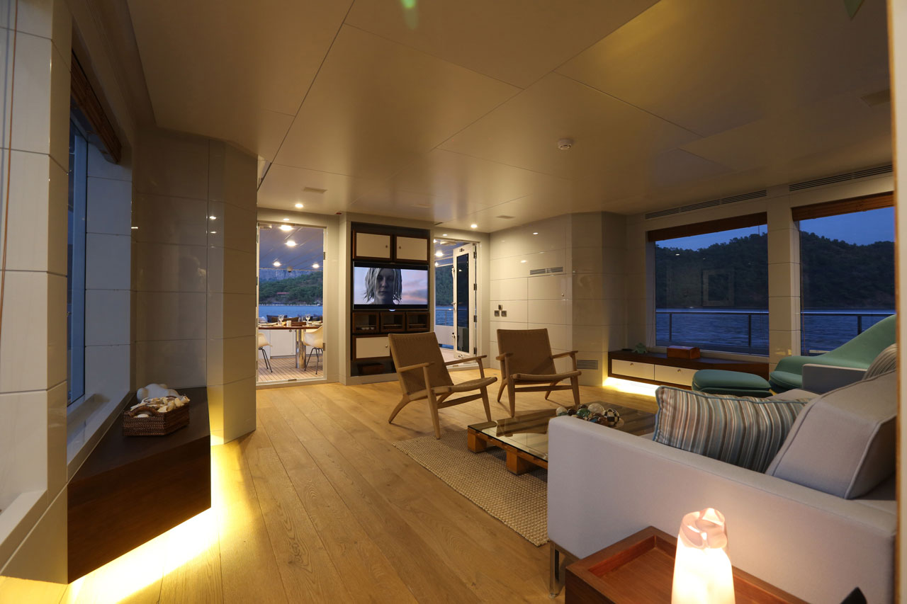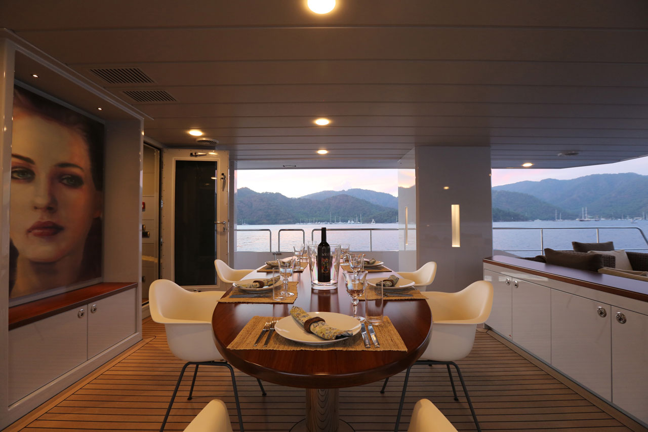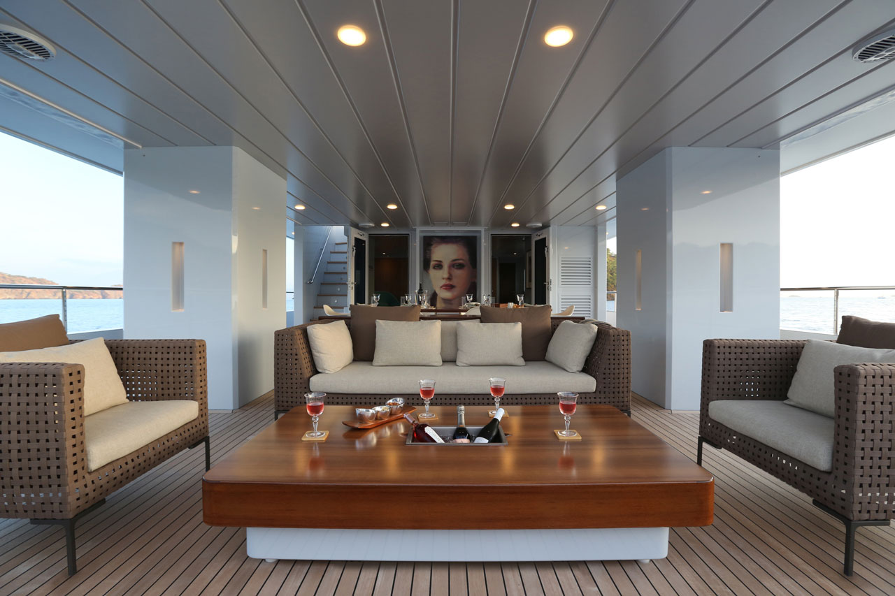 Only Now, a two deck, open planned yacht suitable for island hopping in the Mediterranean. A more angular, sleeker style was aimed, with special lifestyle features throughout the boat, such as the dining area with benches in the upper deck. The main deck space transitions seamlessly from the a la carte dining area to the salon.